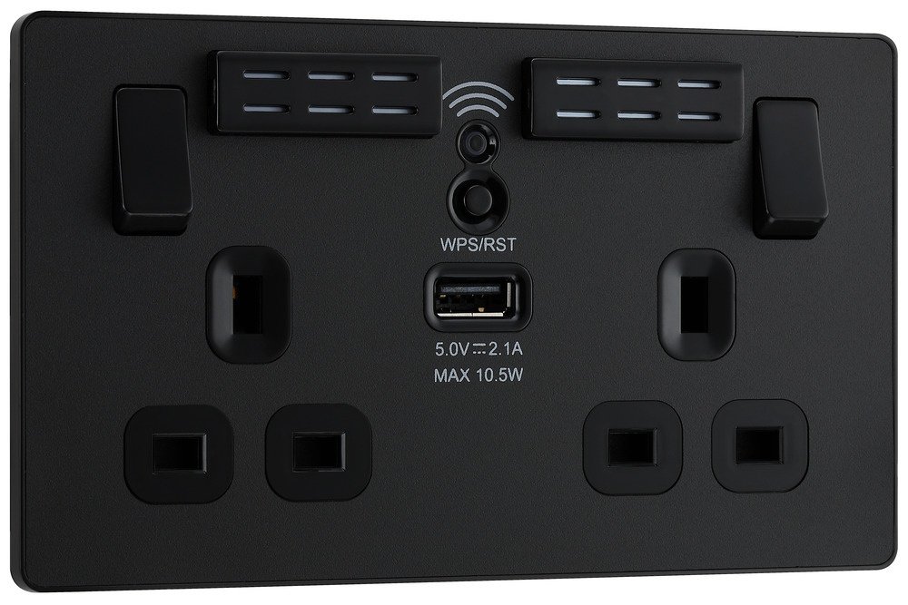 13A Rated|Easy to install, supplied with fixing screws and installation instructions|1x 2.1A USB outlet for charging your mobile devices|Improved Wi-Fi coverage throughout your home, works with all wireless broadband routers|Easy to setup with one touch WPS|Single band (2.4Ghz)|Angled in-line terminals with captive screws provide easy access for quick installation|Twin earth fitted as standard for high integrity circuits|Screwless front plate clips on and off easily, ideal for redecorating – polycarbonate construction