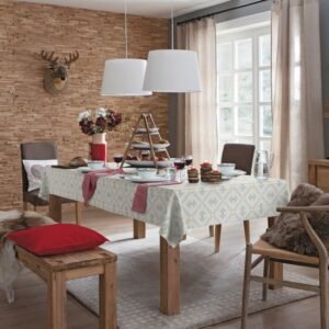 Wipe-clean easy care tablecloth.|Foodsafe.|Suitable for contact with food.|Can be used indoors and outdoors.|Can be ironed on reverse on a low setting.