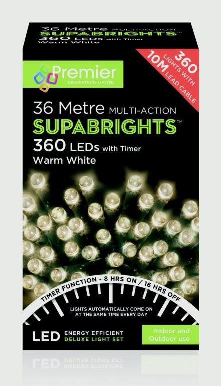 These LED strings with timer are superbright, energy efficient, long lasting & durable,They can be used indoors or outdoors,Fitted with a multi action electronic controller with 8 functions including static,10m cable from transformer to first bulb,Easy to use push button timer, press once for lights to activate