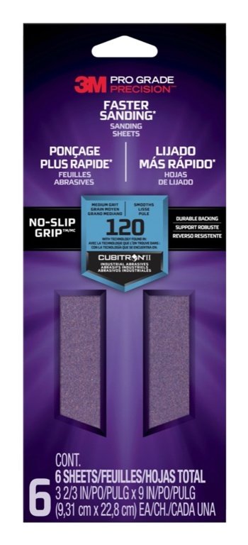 3M Pro Grade Precision Faster Sanding Sanding Sheets are better than ever, thanks to the combination of NO-SLIP GRIP backing and premium mineral technology found in CUBITRON II Industrial Abrasives, providing longer sheet life, less effort and less hand fatigue than conventional sandpaper.|NO-SLIP GRIP backing and durable materials help reduce hand fatigue|Premium mineral grits are made with technology found in Cubitron II Industrial Abrasives|Suitable for wet sanding and dry sanding|Sandpaper color will not discolor the surface you are sanding|Conforms to your surface for easier sanding